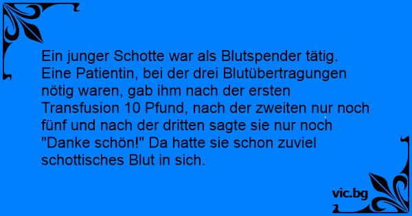 Eine Patientin, bei der drei Blutübertragungen nötig waren, gab ihm nach der ersten Transfusion 10 Pfund, nach der zweiten nur noch fünf und nach der dritten sagte sie nur noch "Danke schön!" Da hatte sie schon zuviel schottisches Blut in sich.