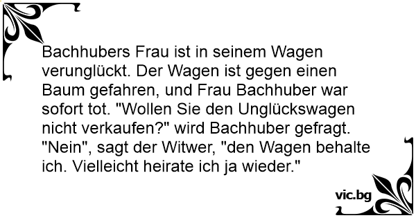 Bachhubers Frau ist in seinem Wagen verunglückt. Der Wagen ist gegen einen Baum gefahren, und Frau Bachhuber war sofort tot. "Wollen Sie den Unglückswagen niсhт verkaufen?" wird Bachhuber gefragt.