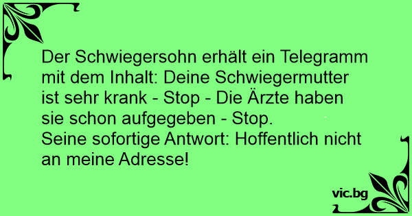 Der Schwiegersohn erhält ein Telegramm mit dem Inhalt: Deine Schwiegermutter ist sehr krank - Stop - Die Ärzte haben sie schon aufgegeben - Stop.