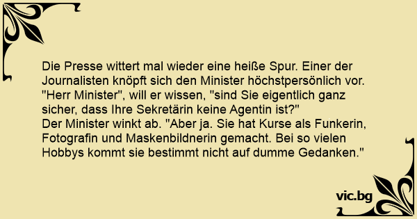 Die Presse wittert mal wieder eine heiße Spur. Einer der Journalisten knöpft sich den Minister höchstpersönlich vor. "Herr Minister", will er wissen, "sind Sie eigentlich ganz sicher, dass Ihre Sekretärin keine Agentin ist?"