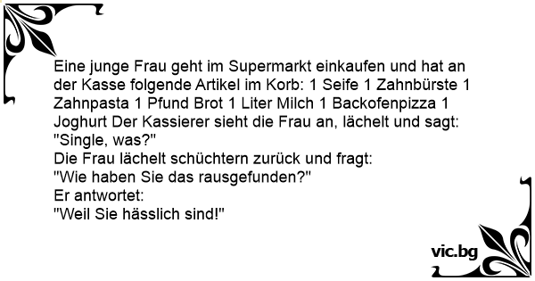 En pige lægger sine varer op ved kassen: 1 tomat, 1 lille pose kaffe, 1 frossen færdigret, 1 tærte, 1 müslibar og en frossen pizza! Manden ved kassen spørger smilende: – Single, hva? Pigen smiler...