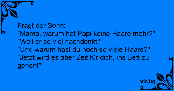 "Mami Mami, warum hat der Papa so wenige Haare?" "Weil er so viel denkt, mein Kleiner." "Und warum hast Du so viele Haare?" "Jetzt ist's aber Zeit, ins Bett zu gehen!"