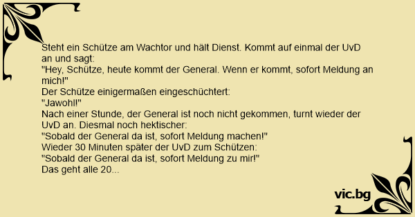 "Hey, Schütze, heute kommt der General. Wenn er kommt, sofort Meldung an mich!"
