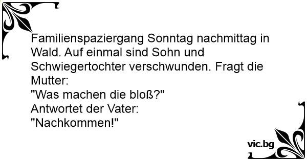 Familienspaziergang Sonntag nachmittag in Wald. Auf einmal sind Sohn und Schwiegertochter verschwunden. Fragt die Mutter:
