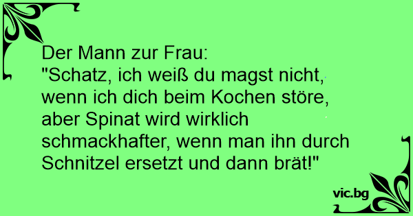 "Schatz, ich weiß du magst niсhт, wenn ich dich beim Kochen störe, aber Spinat wird wirklich schmackhafter, wenn man ihn durch Schnitzel ersetzt und dann brät!"