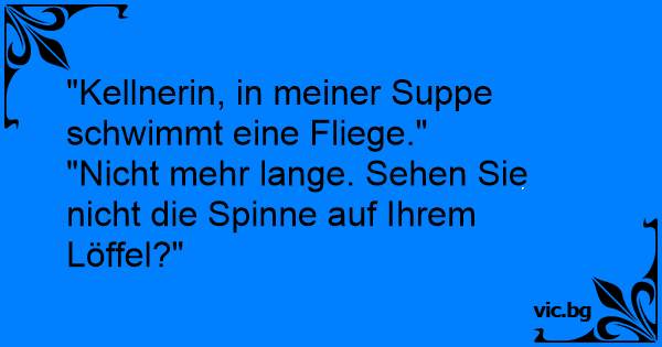 - Kelner, det er en flue i suppen min! - Ta det helt med rolig, det varer nok ikke så lenge! Ser De ikke edderkoppen på skjeen Deres?