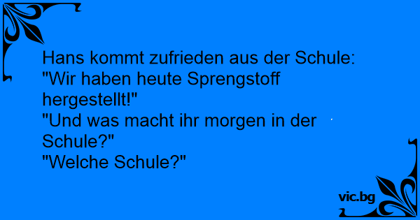 Schule. Fritzchen erzählt daheim: „Heute haben wir in der Schule Sprengstoff hergestellt“. Mama: „So, und was macht ihr morgen in der Schule“? Fritzchen: „Welche Schule“?