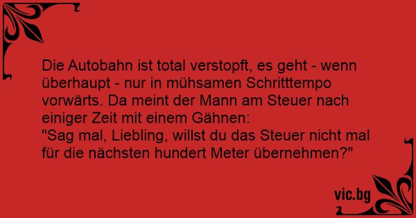 Die Autobahn ist total verstopft, es geht - wenn überhaupt - nur in mühsamen Schritttempo vorwärts. Da meint der Mann am Steuer nach einiger Zeit mit einem Gähnen: