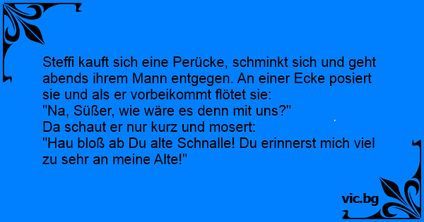 Steffi kauft sich eine Perücke, schminkt sich und geht abends ihrem Mann entgegen. An einer Ecke posiert sie und als er vorbeikommt flötet sie: