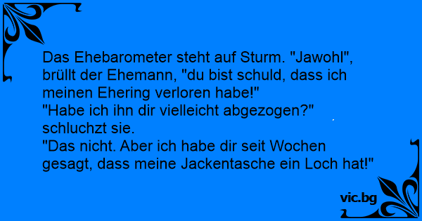 Das Ehebarometer steht auf Sturm. "Jawohl", brüllt der Ehemann, "du bist schuld, dass ich meinen Ehering verloren habe!"