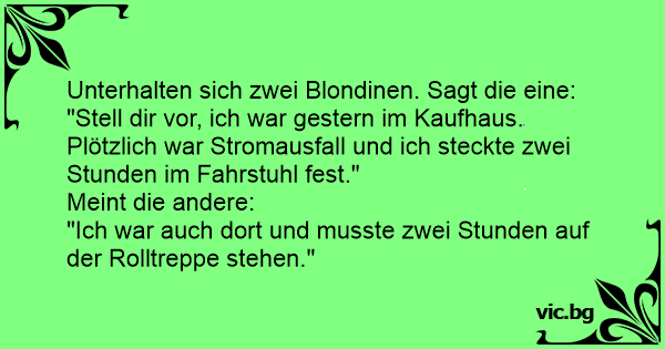 Sagt die eine Blondine zu der anderen: „Weißt du, was? Gestern steckte ich eine Stunde wegen Stromausfall im Aufzug fest.“ Darauf die andere: „Ich steckte gestern sogar zwei Stunden auf der...