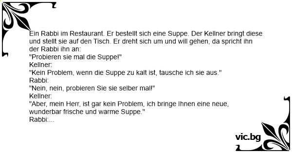Ein Rabbi im Restaurant. Er bestellt sich eine Suppe. Der Kellner bringt diese und stellt sie auf den Tisch. Er dreht sich um und will gehen, da spricht ihn der Rabbi ihn an: