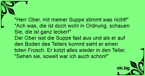 Der Ober isst die Suppe fast aus und als er auf den Boden des Tellers kommt sieht er einen toten Frosch. Er kotzt alles wieder in den Teller. "Sehen sie, soweit war ich auch schon!"