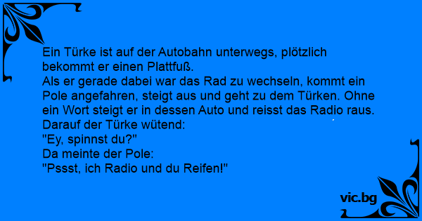 Als er gerade dabei war das Rad zu wechseln, kommt ein Pole angefahren, steigt aus und geht zu dem Türken. Ohne ein Wort steigt er in dessen Auto und reisst das Radio raus. Darauf der Türke wütend: