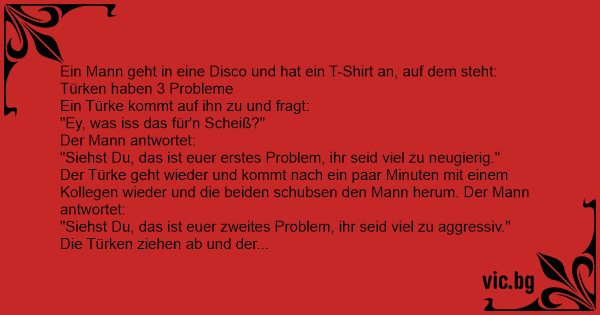 Ateina rusas į diskoteką Vokietijoje. Užsidėjęs ryškius marškinėlius su užrašu “Turkai turi 3 problemas”. Iškart prisistato turkas ir pareikalauja pasiaiškinti dėl įžulumo ir nusiimt maikoną. -...