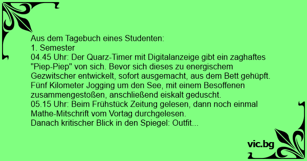 23.00 Uhr: Vorlesungsmitschriften durchgelesen und Hausaufgaben gemacht. Festgestellt: 18-Stunden-Tag zu kurz. Werde demnächst die Nacht hinzunehmen.