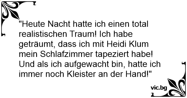 "Heute Nacht hatte ich einen total realistischen Traum! Ich habe geträumt, dass ich mit Heidi Klum mein Schlafzimmer tapeziert habe! Und als ich aufgewacht bin, hatte ich immer noch Kleister an der Hand!"