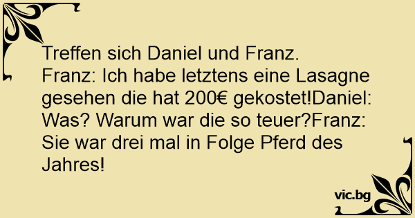 Treffen sich Daniel und Franz.<br />Franz: Ich habe letztens eine Lasagne gesehen die hat 200€ gekostet!Daniel: Was? Warum war die so teuer?Franz: Sie war drei mal in Folge Pferd des Jahres!
