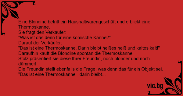 Blondynka wchodzi do sklepu i jej uwagę przyciąga błyszczący obiekt na półce, zaciekawiona pyta sprzedawcę: - Co to jest? - Termos - odpowiada sprzedawca. - Do czego służy - pyta znów blondynka. - Pomaga utrzymać gorące rzeczy gorącymi, natomiast zimne zimnymi - objaśnia sprzedawca. Blondynka...