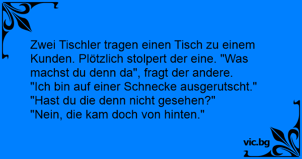 Zwei Tischler tragen einen Tisch zu einem Kunden. Plötzlich stolpert der eine. "Was machst du denn da", fragt der andere.