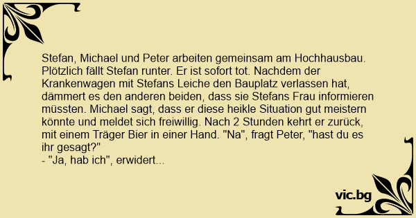Plötzlich fällt Stefan runter. Er ist sofort tot. Nachdem der Krankenwagen mit Stefans Leiche den Bauplatz verlassen hat, dämmert es den anderen beiden, dass sie Stefans Frau informieren müssten. Michael sagt, dass er diese heikle Situation gut meistern könnte und meldet sich freiwillig. Nach 2 Stunden kehrt er zurück, mit einem Träger Bier in einer Hand. "Na", fragt Peter, "hast du es ihr gesagt?"