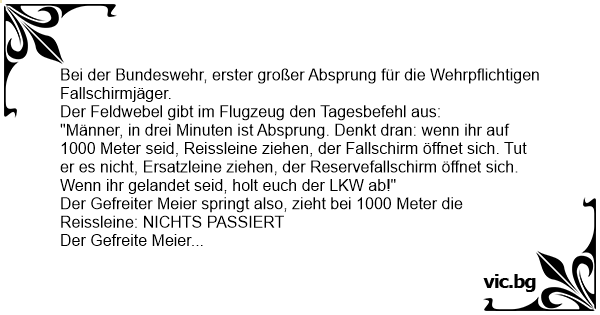Nový příslušník paradesantní jednotky se chystá ke svému prvnímu seskoku. Pečlivě si projde své poznámky ze školení: 1) vyskočit z letadla, 2) počítat do 20 a zatáhnout za levou šňůrku, 3)...