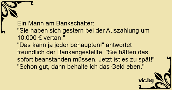 "Das kann ja jeder behaupten!" antwortet freundlich der Bankangestellte. "Sie hätten das sofort beanstanden müssen. Jetzt ist es zu spät!"