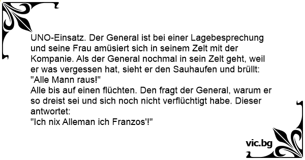 UNO-Einsatz. Der General ist bei einer Lagebesprechung und seine Frau amüsiert sich in seinem Zelt mit der Kompanie. Als der General nochmal in sein Zelt geht, weil er was vergessen hat, sieht er den Sauhaufen und brüllt: