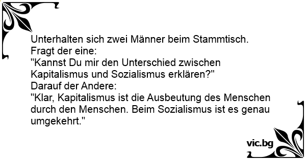 "Klar, Kapitalismus ist die Ausbeutung des Menschen durch den Menschen. Beim Sozialismus ist es genau umgekehrt."