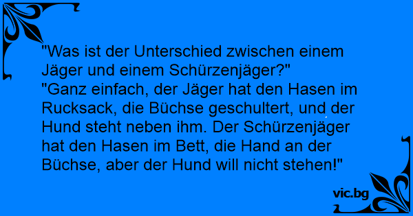 "Ganz einfach, der Jäger hat den Hasen im Rucksack, die Büchse geschultert, und der Hund steht neben ihm. Der Schürzenjäger hat den Hasen im Bett, die Hand an der Büchse, aber der Hund will niсhт stehen!"