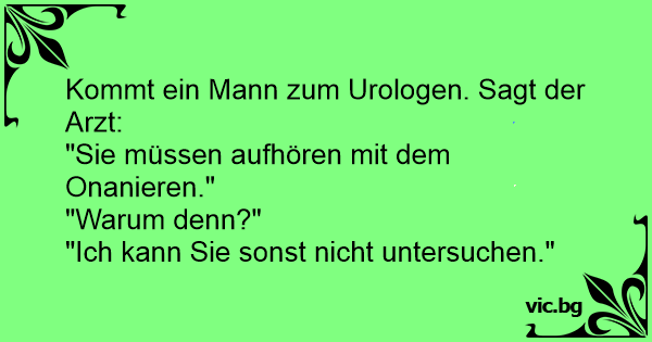 Ein Mann beim Urologen. Der Urologe: „Sie müssen unbedingt mit dem Onanieren aufhören!“ Der Mann: „Warum denn das?“ Der Urologe: „Weil ich Sie sonst nicht untersuchen kann!“