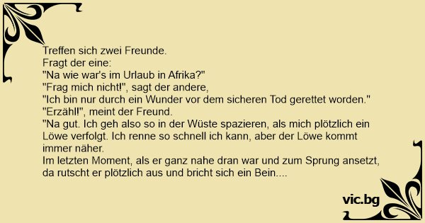"Na gut. Ich geh also so in der Wüste spazieren, als mich plötzlich ein Löwe verfolgt. Ich renne so schnell ich kann, aber der Löwe kommt immer näher.
