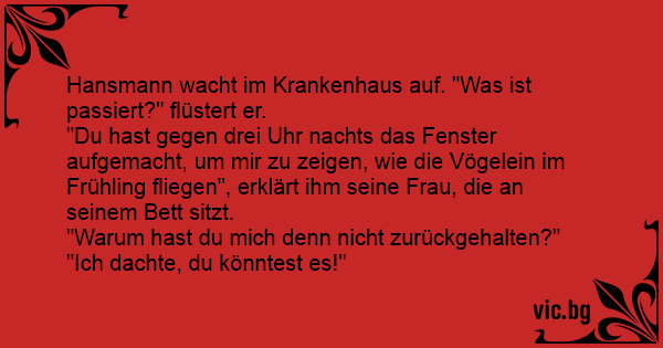 "Du hast gegen drei Uhr nachts das Fenster aufgemacht, um mir zu zeigen, wie die Vögelein im Frühling fliegen", erklärt ihm seine Frau, die an seinem Bett sitzt.