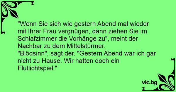 "Wenn Sie sich wie gestern Abend mal wieder mit Ihrer Frau vergnügen, dann ziehen Sie im Schlafzimmer die Vorhänge zu", meint der Nachbar zu dem Mittelstürmer.