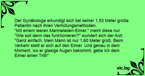 "Ganz einfach. Mein Mann ist nur 1,60 Meter groß. Beim Verkehr stellt er sich auf den Eimer. Und genau in dem Moment, wo er glasige Augen bekommt, gebe ich dem Eimer einen Tritt!"