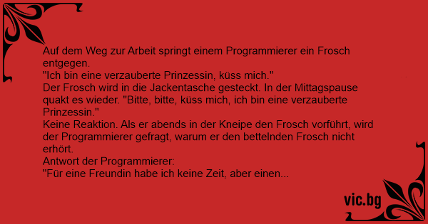 Keine Reaktion. Als er abends in der Kneipe den Frosch vorführt, wird der Programmierer gefragt, warum er den bettelnden Frosch niсhт erhört.
