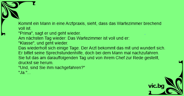 Das wiederholt sich einige Tage. Der Arzt bekommt das mit und wundert sich. Er bittet seine Sprechstundenhilfe, doch bei dem Mann mal nachzufahren.