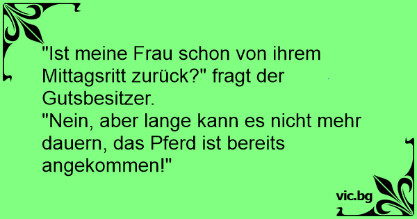 "Ist meine Frau schon von ihrem Mittagsritt zurück?" fragt der Gutsbesitzer.