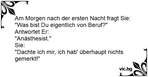 Nākamajā rītā pēc pirmās nakts. Viņa: ?Kāda īsti ir tava profesija?? Viņš: ?Anesteziologs.? Viņa: ?Tagad skaidrs, kāpēc es neko nejutu.?