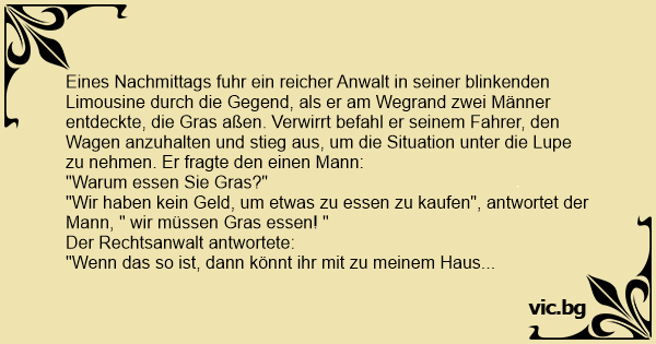 Eines Nachmittags fuhr ein reicher Anwalt in seiner blinkenden Limousine durch die Gegend, als er am Wegrand zwei Männer entdeckte, die Gras aßen. Verwirrt befahl er seinem Fahrer, den Wagen anzuhalten und stieg aus, um die Situation unter die Lupe zu nehmen. Er fragte den einen Mann: