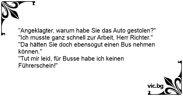 “Warum haben Sie denn das Auto gestohlen?” “Ich musste dringend zur Arbeit, Herr Richter.” “Ja, und warum haben Sie nicht einfach den Bus genommen?” “Weil mein Führerschein für Busse nicht gilt!”