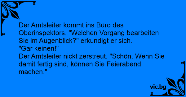 Der Amtsleiter kommt ins Büro des Oberinspektors. "Welchen Vorgang bearbeiten Sie im Augenblick?" erkundigt er sich.