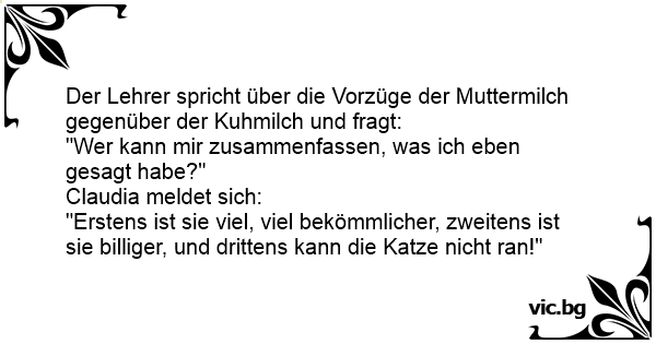 Der Lehrer spricht über die Vorzüge der Muttermilch gegenüber der Kuhmilch und fragt: