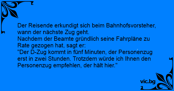 "Der D-Zug kommt in fünf Minuten, der Personenzug erst in zwei Stunden. Trotzdem würde ich Ihnen den Personenzug empfehlen, der hält hier."