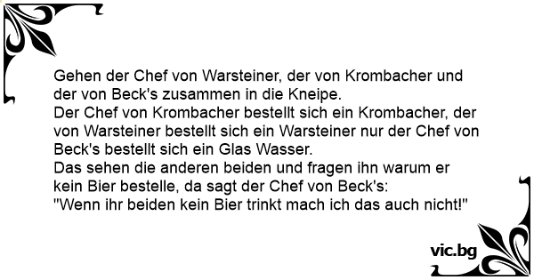 Der Chef von Krombacher bestellt sich ein Krombacher, der von Warsteiner bestellt sich ein Warsteiner nur der Chef von Beck's bestellt sich ein Glas Wasser.