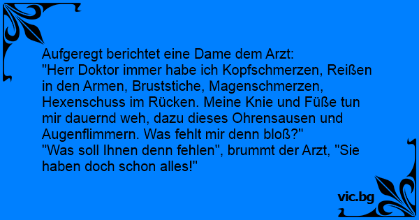 "Herr Doktor immer habe ich Kopfschmerzen, Reißen in den Armen, Bruststiche, Magenschmerzen, Hexenschuss im Rücken. Meine Knie und Füße tun mir dauernd weh, dazu dieses Ohrensausen und Augenflimmern. Was fehlt mir denn bloß?"