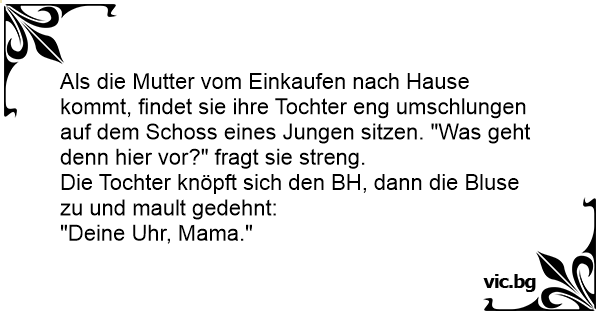 Als die Mutter vom Einkaufen nach Hause kommt, findet sie ihre Tochter eng umschlungen auf dem Schoss eines Jungen sitzen. "Was geht denn hier vor?" fragt sie streng.