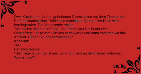Zwei Kandidaten für den gehobenen Dienst sitzen vor dem Zimmer der Prüfungskommission. Beide sind mächtig aufgeregt. Der Erste wird hereingerufen. Der Vorsitzende erklärt: