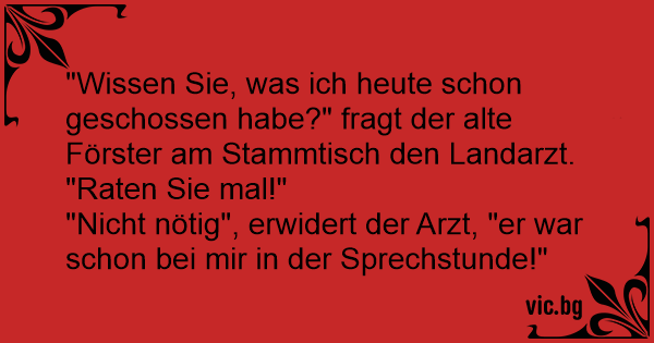 "Wissen Sie, was ich heute schon geschossen habe?" fragt der alte Förster am Stammtisch den Landarzt. "Raten Sie mal!"