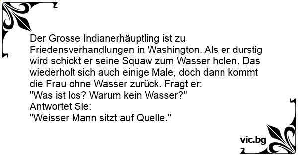 Der Grosse Indianerhäuptling ist zu Friedensverhandlungen in Washington. Als er durstig wird schickt er seine Squaw zum Wasser holen. Das wiederholt sich auch einige Male, doch dann kommt die Frau ohne Wasser zurück. Fragt er: